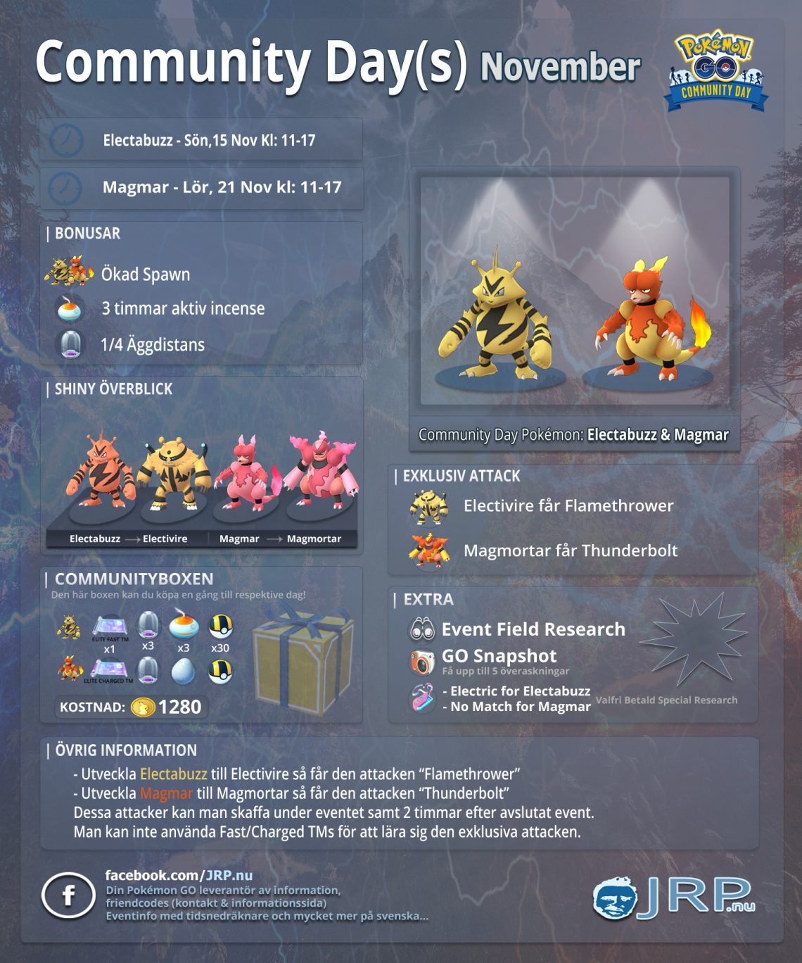 CD, Grafik Community Day(s) November Electabuzz & Magmar Electabuzz – Läs mer här: https://jrp.nu/events/community-day-november-electabuzz/ Magmar – Läs mer här: https://jrp.nu/events/community-day-november-magmar/